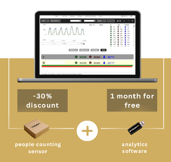 Up to a limited set of 20 pieces, we’re offering the COUNTR Stereo people counting sensors with 30% discount along with a free month of software license.