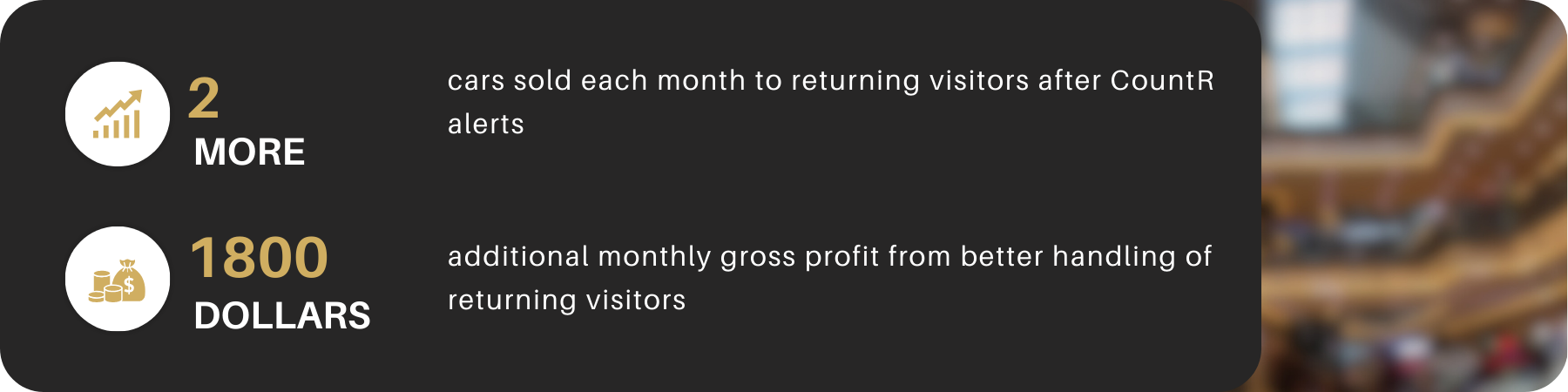 For 60 targeted visitors this meant a lift from about 7 to 9 car sales per month. With an average gross profit of 900 dollars per vehicle, the dealerships gained close to 1 800 dollars additional profit every month from better handling of returning visitors. At the same time managers used the time and zone insights to position staff and information materials around the areas that repeatedly attracted the most serious buyers.