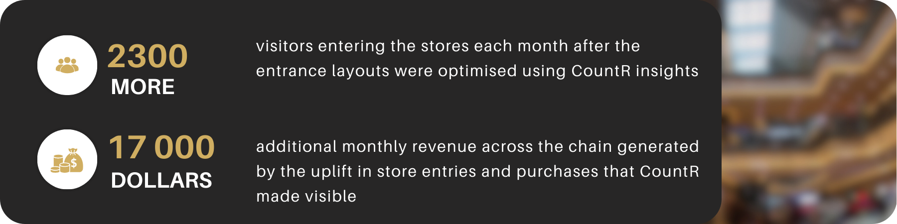 CountR returning visitor tracking showed that many people who passed regularly in front of the stores eventually entered after a change in entrance concept or message. This helped the chain understand how long it often took for an entrance idea or campaign to begin delivering results, instead of judging it only on the first few days.