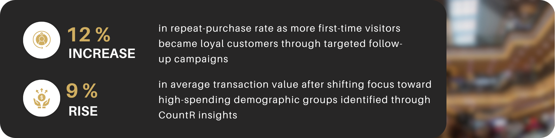 After installing CountR’s in-store analytics system, the team began tracking return-visitor frequency alongside demographic profiles. In the first month, 33 percent of all visitors were identified as returning customers. After six months, that share grew modestly but meaningfully to 39 percent, translating to about 700 additional repeat visitors each month.