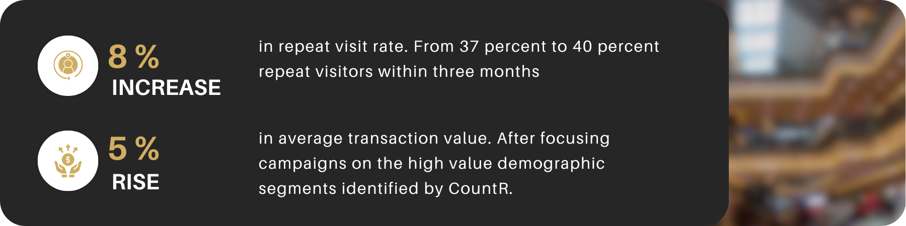 After six months of using CountR insights, targeted communication and simple bounce back offers at the till, the share of customers who returned within three months rose to about 40 percent. With a similar overall visitor base, this meant just over 700 more customers coming back for at least one additional visit per quarter, or roughly 240 extra returning visitors each month.